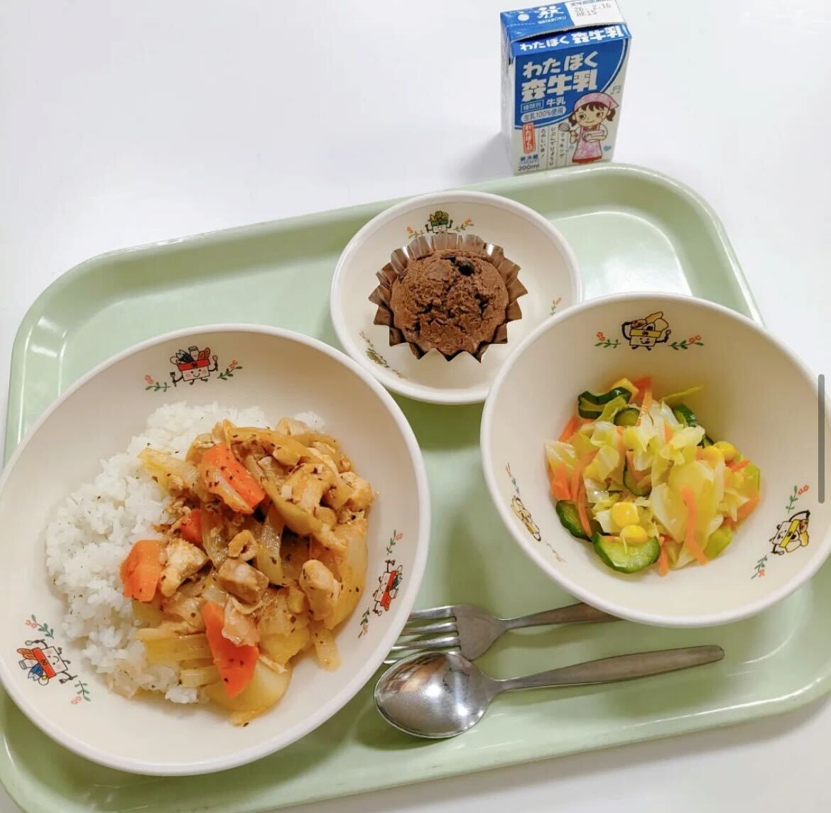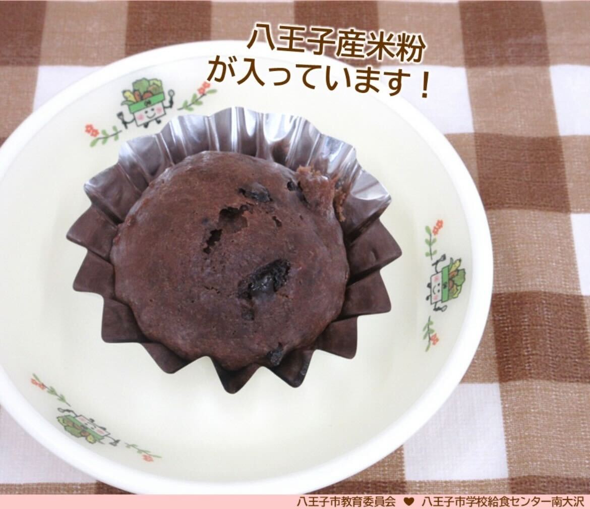 八王子市の学校給食で、髙尾の天狗を造る時に出る副産物の米粉を使った「はち米っこココアカップケーキ」が提供されました。